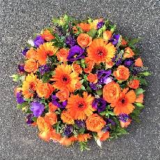This beautiful, bright, foliage edged combination of purples and oranges makes a beautiful posy arrangement.