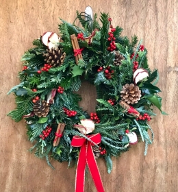 This traditional Christmas door wreath is created with Christmas spruce, fern and holly. Festively decorated with pine cones, cinnamon, fruit slices, and berries. Finished off with a velvet red bow.