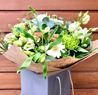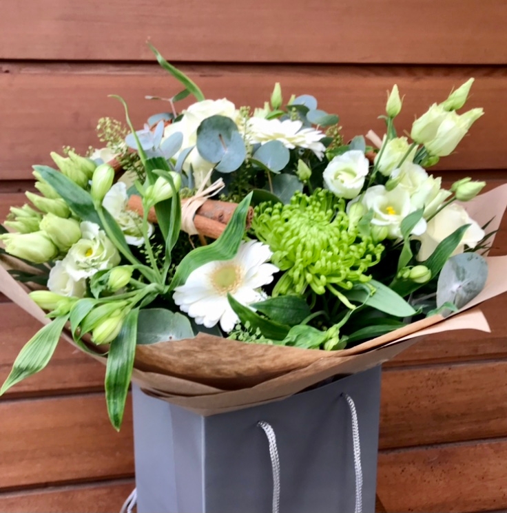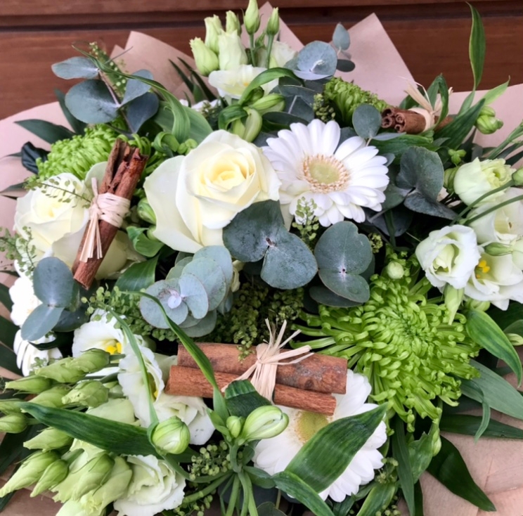 A beautiful hand tied bouquet made up of whites and greens with eucalyptus and cinnamon sticks is a lovely Christmas gift or Christmas display in your home.