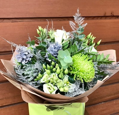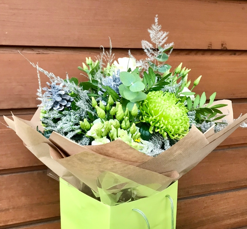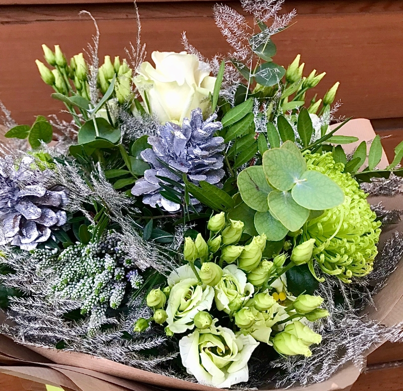 This gorgeous bouquet of Christmas silvers, whites and greens, made that little extra special for Christmas with pine cones and twigs to add that little bit of Christmas Sparkle.