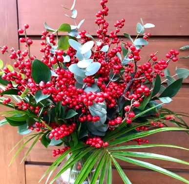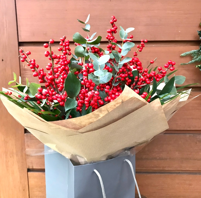 A bright festive hand tied of all ilex berries with eucalyptus is an eye catching Christmas display or gift.